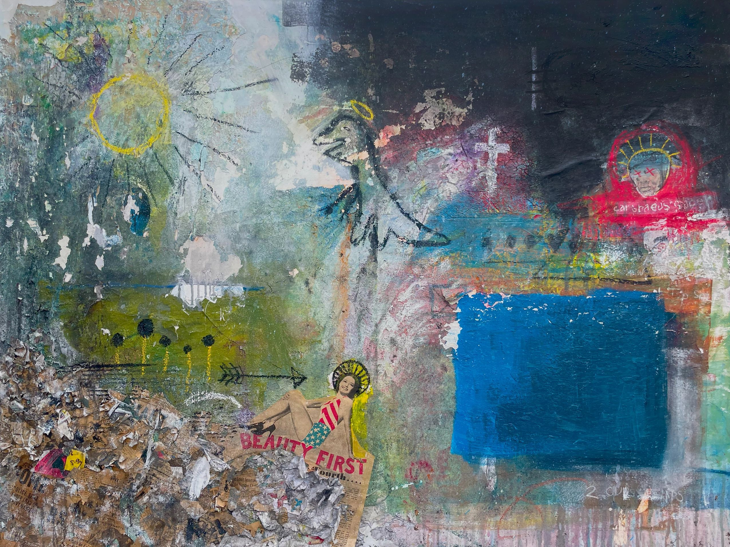 Acrylic, pastel, gold paint, newspaper on canvas